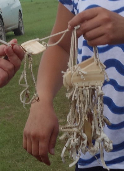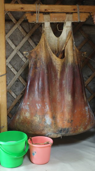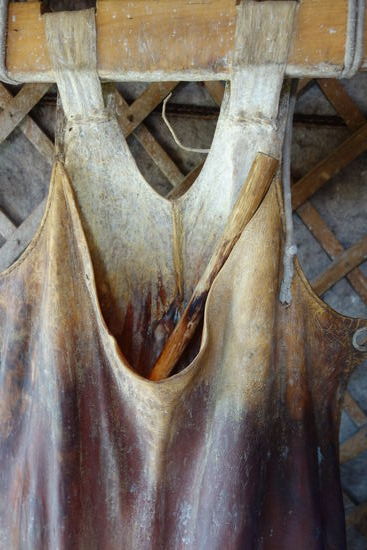 Auf einem kreisförmigen Rahmen errichten sie aus Weidenflechtwerk ihre Jurte, ihr Schlaf- und Wohnzelt. Die Streben bestehen aus Zweigen, die nach oben in einen Reifen zusammenlaufen. Darüber erhebt sich kragenförmig ein Schornstein. Das Gerüst bekleiden sie mit weißem Filz... Vor den Eingang hängen sie ebenfalls Filz, der mit bunten Stickereien verziert ist ...