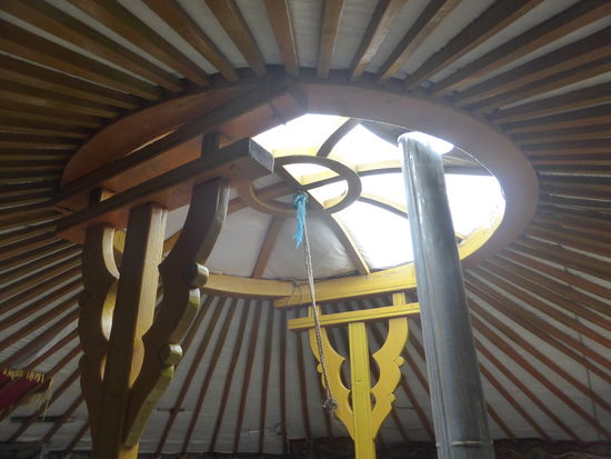 Im Alllag sind heute die fünfwandigen Jurten am gängigsten. Eine Wand besteht aus mehreren biegsamen Holzlatten, die so miteinander verbunden sind, dass sie sich schcrenartig auseinanderziehen oder zusammendrücken lassen. Für die Verbindung der Latten werden kleine Nägel aus Leder verwandt. Fünf auseinandergezogene, im Kreis aufgestellte und miteinander verzurrte Wände umschließen gemeinsam mit dem Türrahmen eine Fläche von etwa 25 Quadratmetern. In der Mitte der Jurte werden zwei Stützen aufgestellt, die den Dachkranz halten. Er dient auch als Rauchöffnung. Fenster und Uhr. denn je nach Lichteinfall kann man die Tageszeit ablesen.