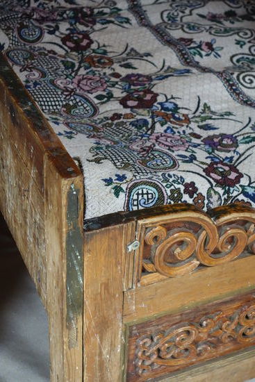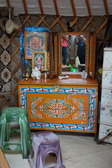 Inder Mitte der Jurte steht der Ofen. Um ihn dreht sich alles. Er spendet Wärme, auf ihm wird Tee und Essen zubereitet. Er ist aber nicht nur offensichtliches Zentrum des Alltags. Das brennende Feuer stellt den kultischen Mittelpunkt der Jurte dar. Die Gottheit des Herdfeuers hat hier ihren Silz.