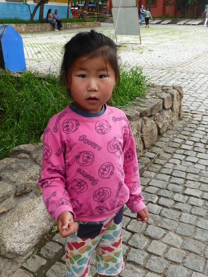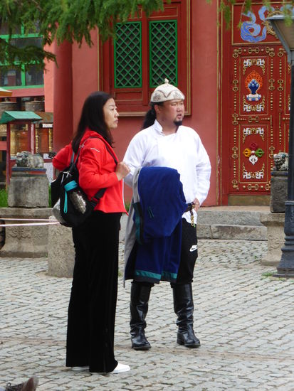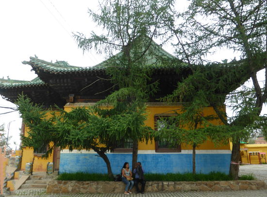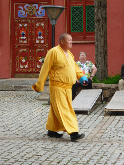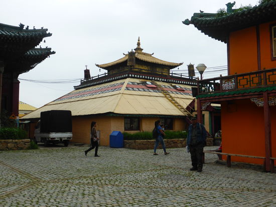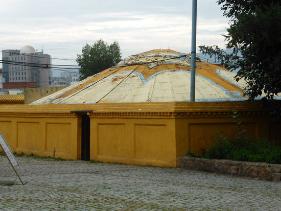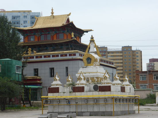 Für den Vormittag hat Zula den Besuch des Gandan-Klosters angekündigt. Es liegt ein wenig außerhalb in einem Viertel im Westen der Hauptstadt, wo auf einem Hügel noch Mongolen in Jurten leben – dort wäre ich gerne einmal hindurchgelaufen, aber das läßt das straffe Programm nicht zu.