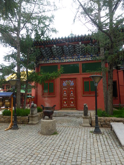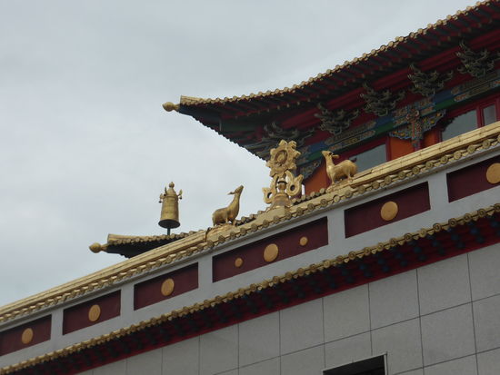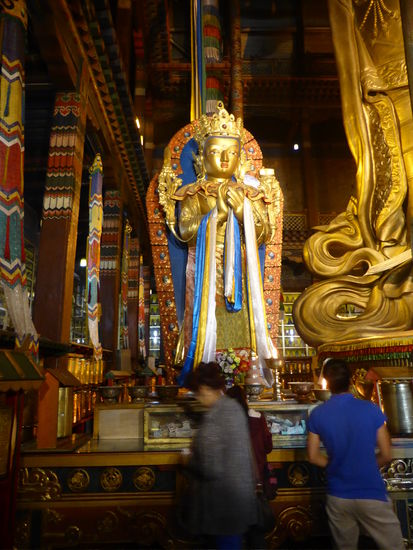 Der größte Tempel ist der Zhanrajsig-Tempel mit einer 26 m hohen Statue des tibetischen Schutzherrn Bodhisattva. Daneben stehen kleinere Statuen, die ‚fotogener‘ sind. Die Gläubigen können kleine Statuen kaufen, die dann in verglasten Regalen an den Wänden aufgestellt sind. Überschlagsmäßig könnten es mehr als 1500 sein.
