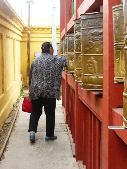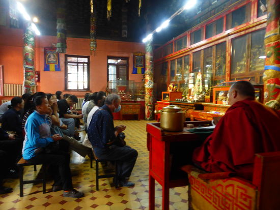 Die Gebetsmühlen kennen wir ja schon, hier werden sie intensiv von Gläubigen gedreht. Auch kann man sich Gebete zur Erhörung seine Wünsche bei Mönchen kaufen. Die eigentliche Messe ist ein ausgesprochen lautes Unterfangen mit Trommeln und Becken.
