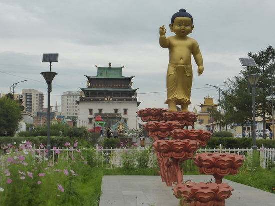 Das markanteste Gebäude ist das weiße Migjid Janraisig Süm, an das sich links die Öndör Gegeen Zanabazar Buddhist University anschließt. Hier befindet sich die 26 Meter hohe Statue der Göttin Janraisig (Sanskrit: Avalokiteshvara), für die das Kloster berühmt ist. 1938 hatten sowjetische Truppen die Statue demontiert und eingeschmolzen. Die buddhistische Gemeinde ließ 1996 mit umgerechnet fünf Millionen Dollar Spenden eine neue vergoldete Janraisig errichten. Für den Dalai Lama, das eigentliche Oberhaupt des Klosters, wurde ein Thronsessel neu erbaut.[/k]