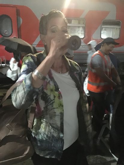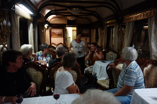 Punkt 23.00 Uhr fährt der Zug los, im Loungewaggon trinken wir noch ein Bier/Wein und unterhalten uns in englisch, spanisch, Portugiesisch mit zwei temperamentvollen Damen, die zur Klaviermusik nicht still sitzen bleiben können und nun Bossa Nova tanzen.
