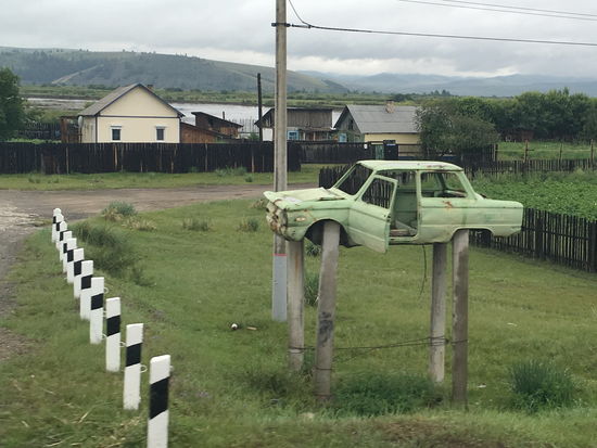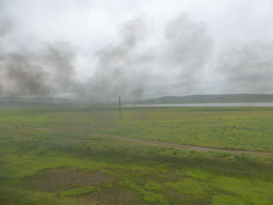 War die Wüste Gobi noch eine grüne Steppenlandschaft, zeigt sich eine ebenso grüne Sumpflandschaft. Gelegentlich kommt ein Güterzug entgegen, den wir an einem kleinen Ort mit Ausweichgleis vorbeilassen müssen, da die Strecke eingleisig ist.