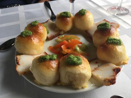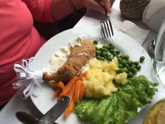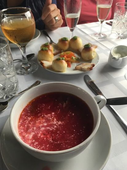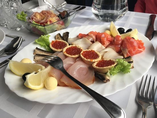 Das Mittagessen ist wieder eine Wucht: hervorragende Fischplatte mit Räucherlachs, Heilbutt, Lachskaviar-Törtchen und kleinen Sardinen. Danach gibt es eine Borschtsch-Suppe mit Sauerrahm und einen entbeinten Hühnerschenkel sowie ein Eis. Ab der Suppe machen nicht mehr alle mit. Das kann man gar nicht alles essen!