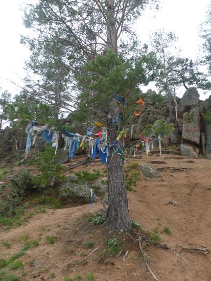 Der Bus nach Tabargatayskiy legt an einer Pilgerstätte der Altgläubigen, dem sogenannten Löwenberg einen Stop ein. Es handelt sich um eine UNESCO-registrierte Stätte. An den Bäumen hängen bunte Lappen, die dort Pilger angebracht haben.
