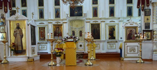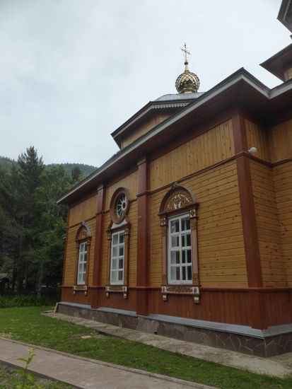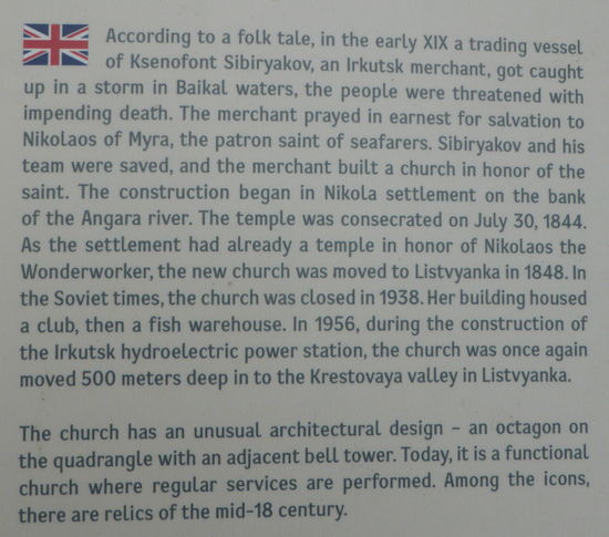 Wir werden auf ein Schiff verfrachtet, um den Angara-Trichter zu umfahren. Dort werden wir von der lokalen Reiseleiterin Ludmilla empfangen und nach Listvjanka gebracht. Der Reiseführer spricht 'vom Ballermann des Baikalsees'. Der Ort ist tatsächlich völlig überlaufen. Die Kirche, die wir besuchen, liegt etwas abseits und daher ruhig. Ludmilla redet wie ein Buch, sie scheint ihr ganzes Wissen in Windeseile verbreiten zu wollen.