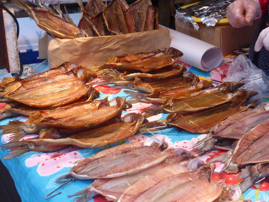 Räucherkisten, deren Inhalt rasenden Absatz findet, durchsichtige Fettfische und eine eigenartige Weise die geäucherten Fische mit Zahnstochern offen zu halten und zu stapeln.