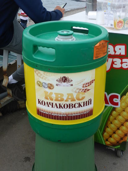 Das Kwas gibt es inzwischen auch in modernen Fässern. Es wird an den Ständen zum Essen getrunken.