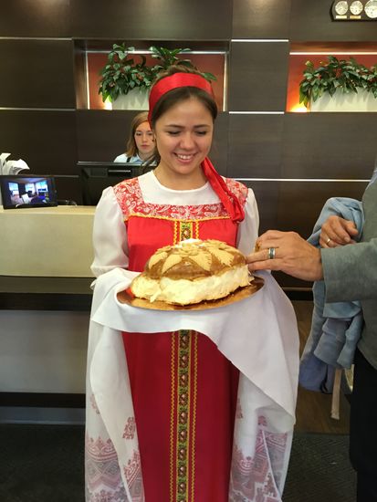 Mit dem Bus fahren wir dann ca. 1 Stunde bis Irkutsk, sehen allerdings nichts von den Staustufen. Im Courtyard Marriott werden wir in der Rezeption wieder einmal mit Brot und Salz begrüßt. Uns erwartet dann wieder ein entsprechendes Zimmer.
