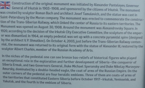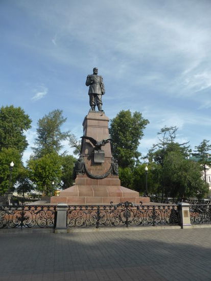 Um 9.00 Uhr (OZ) – ein letztes Mal MEZ + 6 Stunden) beginnt der Stadtrundgang durch Irkutsk mit Ludmilla. Ihr Sprachtempo hat sich nicht verändert und manchmal hat sie Probleme mit dem Atemholen. Sie führt uns zunächst ans Angaraufer, wo eine Statue des Initiators der Transsib steht, Zar Alexander III.