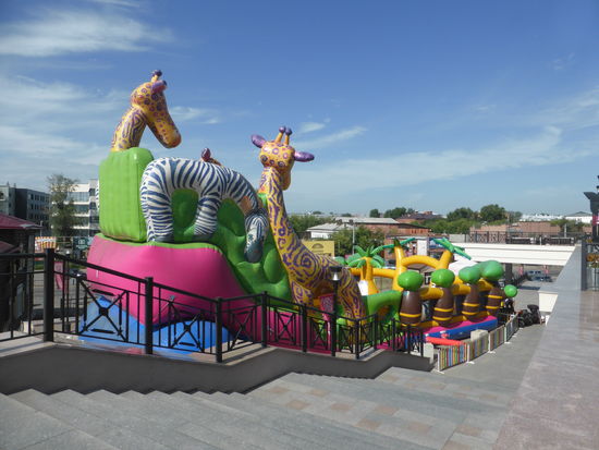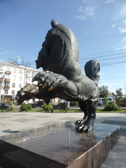 Am Eingang hinter der Kreuzkirche befindet sich ein dem Irkutsker Stadtwappen gewidmetes Denkmal. Dieses Fabelwesen mit dem Zobel im Maul verbirgt eine besondere Geschichte. Eigentlich sollte das Wappen einen Tiger (in der Eingeborenensprache Babr) zeigen. Als man jedoch den Entwurf 1878 in Petersburg eingereicht hatte, interpretierte man dort Babr zu Bobr (russisch für Biber) und korrigierte den vermeintlichen Fehler, in dem man auch die Tierzeichnung anpasste und somit Irkutsk einen Tigerbiber als Wappentier verpaßte