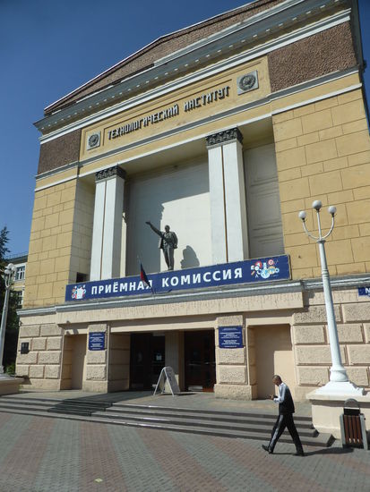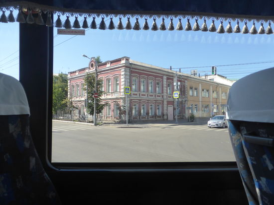 Die findet dann in Windeseile statt in Form einer Fahrt hin und her über zwei der drei parallelen Straßen, - ul. Lenina (z.Zt. gesperrt), ul. Mira und ul. Karla Marksa - die zu eng sind um irgendwelche Bauten links oder/und rechts vom Bussitzplatz zu sehen, geschweige denn zu fotografieren. Obwohl die Straßen ‚verstopft' sind schaffen wir das in weiteren 45 min!