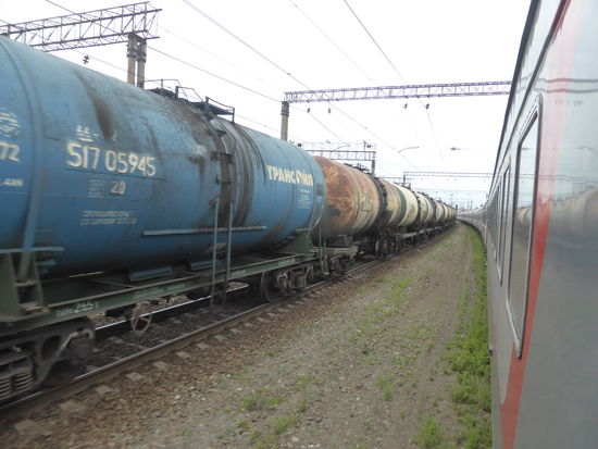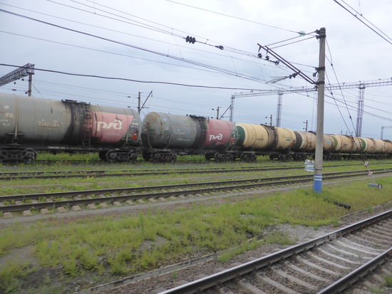Um Tjumen wird es großstädtischer, an den Bahnhöfen stehen auf mehreren Gleisen nebeneinander hunderte Güterwaggons. (134-0264)