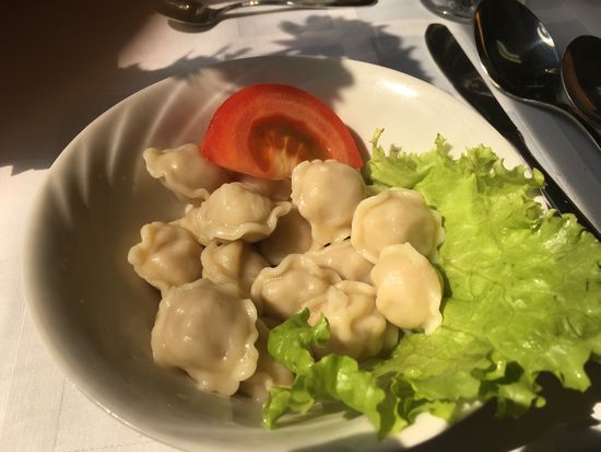 Zum Mittagessen gibt es leckere Miniteigtaschen, Hühnersuppe, Hühnerragout und Obstsalat. Ich bekommen wieder einen Teller mit einem Salatblatt.. (Welch ein Service)!