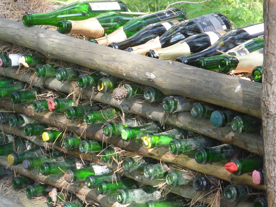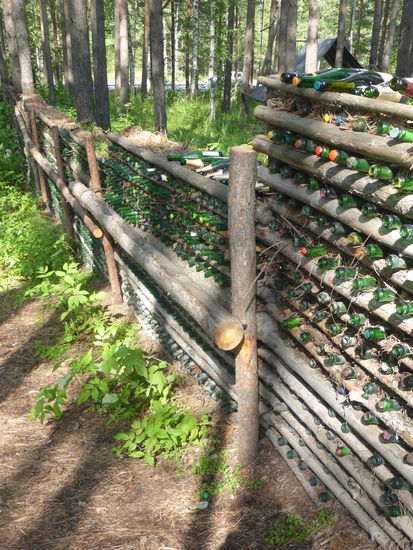 Ich finde die Einfriedung eines Gartens viel interessanter: aus dünnen Ästen und Flaschen wird ein Zaun gebaut, der der Bauweise bei uns mit Steinen und Metallgitter entspricht.