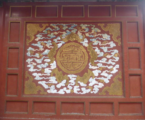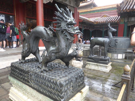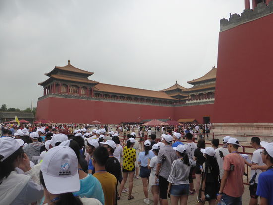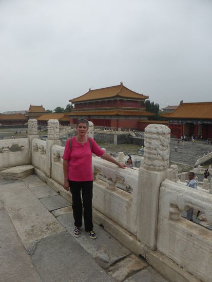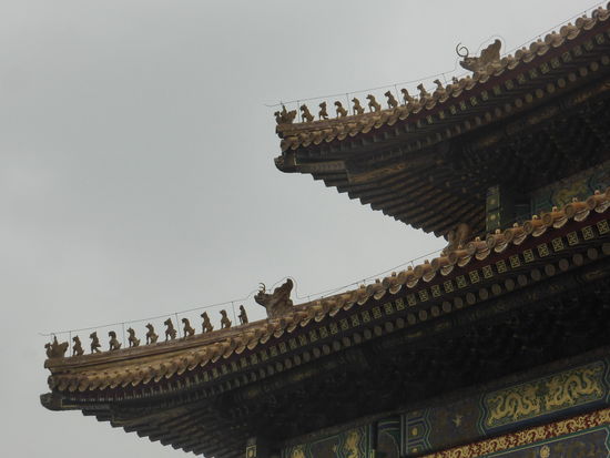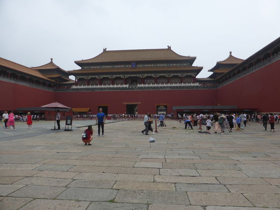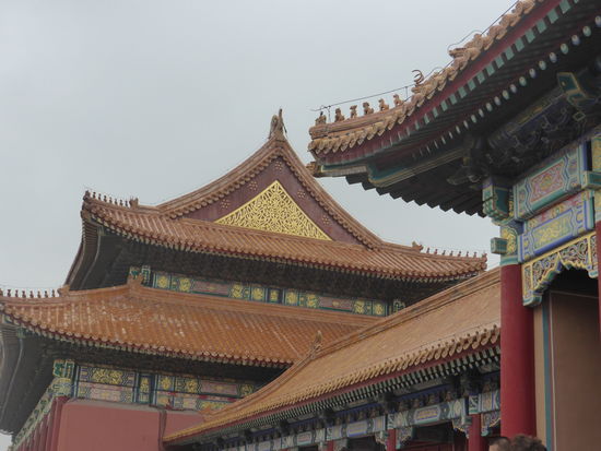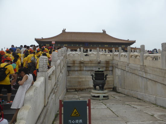 Da wir auch hier durch Wang das Privileg des direkten Eintritts haben, gelangen wir ohne Kontrolle durch das Mittagstor in den ersten Hof und schauen auf das Tor der höchsten Harmonie. Davor liegt die marmorne Goldwasserbrücke, deren mittlerer Gang wie alle mittleren Durchgänge durch die Tore dem Kaiser vorbehalten war. Hat man dieses passiert blickt auf man die Halle der höchsten Harmonie. Man kann die Bauten, die alle der Nord-Süd-Achse folgen gar nicht alle genauestens unterscheiden.