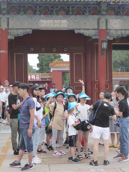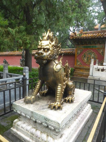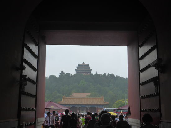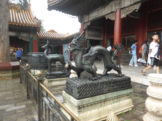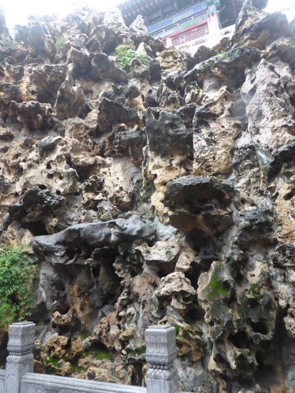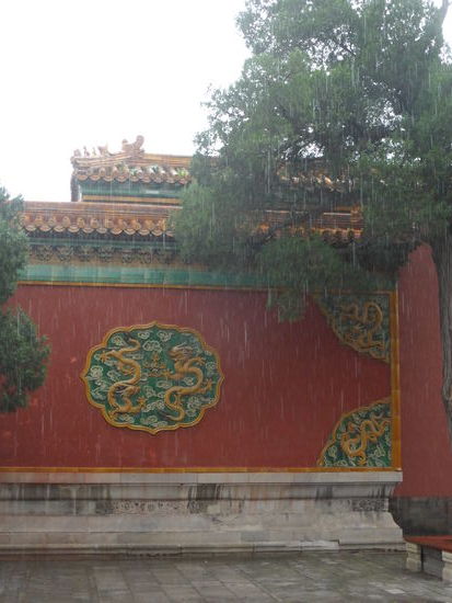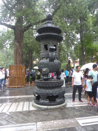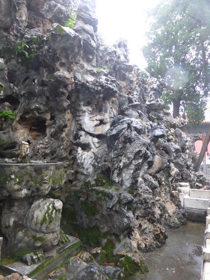 Im kaiserlichen Garten stehen uralte Kiefern und Zypressen, zahlreiche Skulpturen und Steingrotten zeichnen chinesische Gartenbaukunst aus. Leider hat es inzwischen angefangen zu regnen. Einen Schirm hat niemand dabei – aber wegen der Temperaturen warten wir eine kurze Zeit und gehen bei vermindertem Regen zum Bus, der hinter dem Nordtor wartet, zurück.