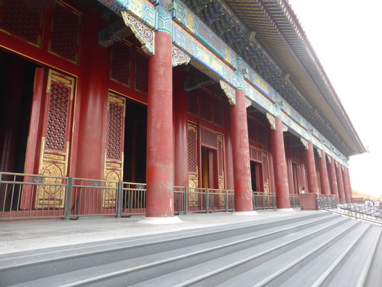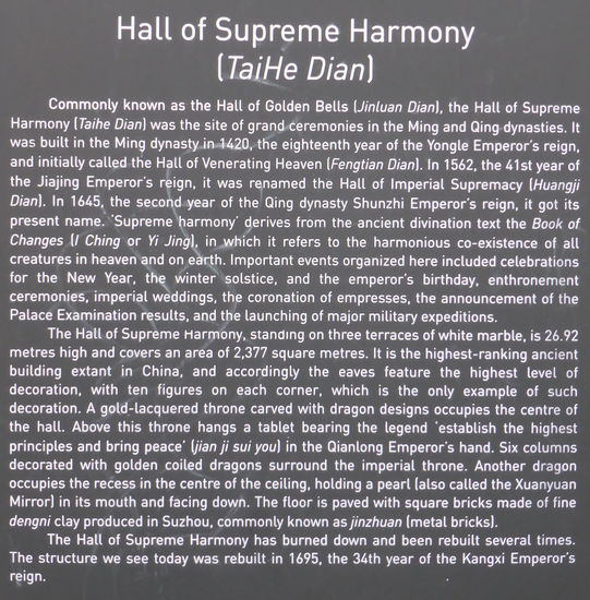 Die Halle der höchsten Harmonie ist die größte Halle des Palastes und gleichzeitig der größte Holzbau des alten Chinas. Zur Kaiserzeit durfte keine anderr Bau den 37m hohen Palast überragen. 72 Säulen stützen den Bau, wobei je 4 Säulen die Bedeutung zukommt einen Raum zu bilden. Auf dieser Basis sollen 9999 Räume im Palast vorhanden sein.
