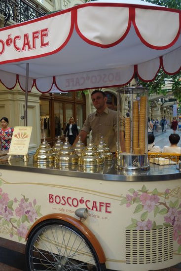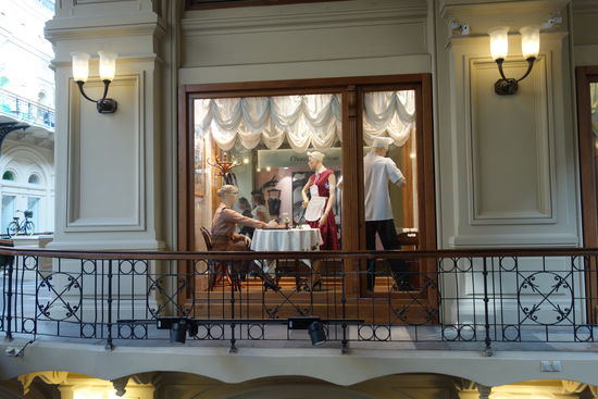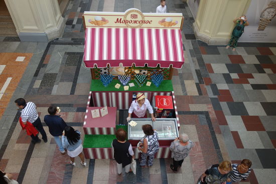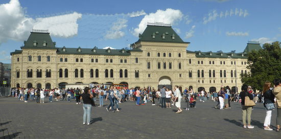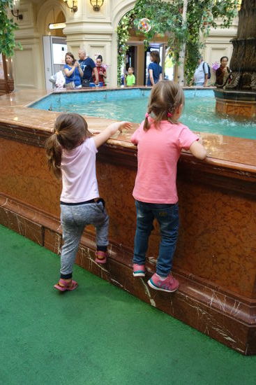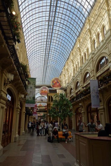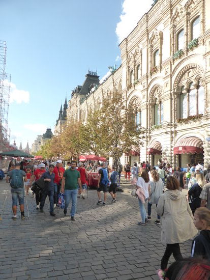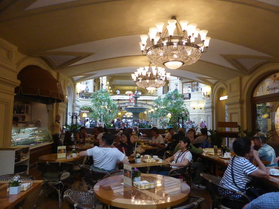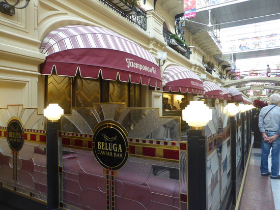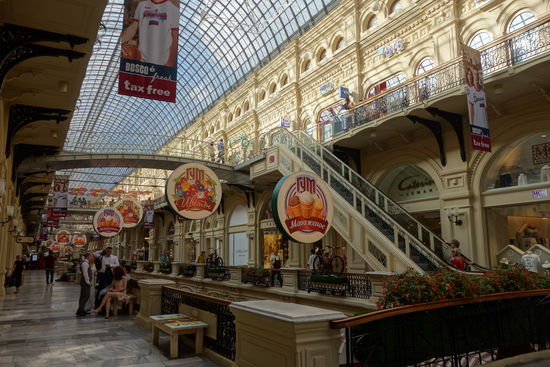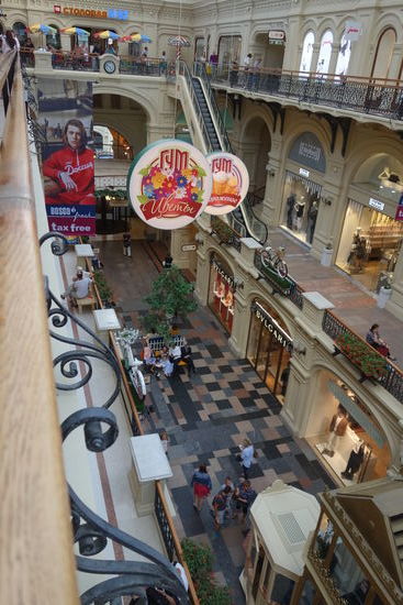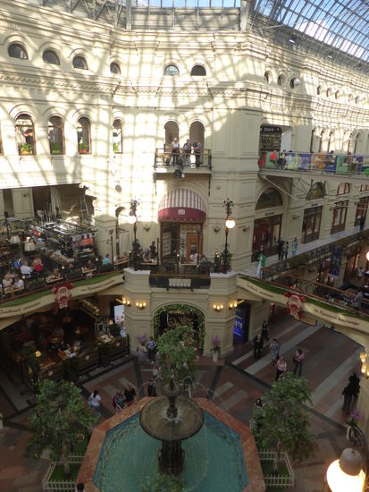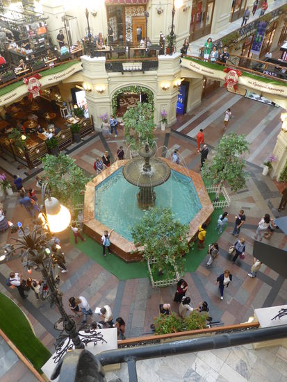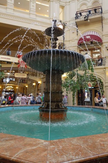 Durch das Nord-Tor (Spasskaya Bashnya) verlassen wir den Kreml wieder und gelangen wieder auf den Roten Platz und begeben uns ins GUM, wo Ulrike den Springbrunnen sucht und Ludmilla uns die Lebensmittelabteilung wärmstens ans Herz legt.