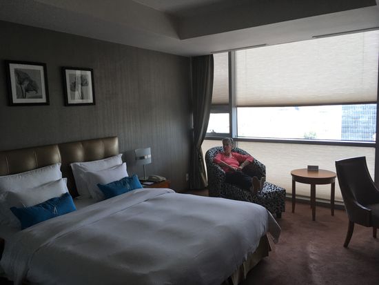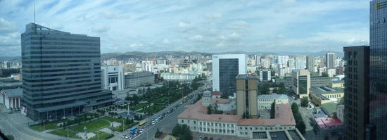 Wir wohnen im extravaganten Blue Sky Tower! Vom 13. Stock haben wir eine tolle Aussicht nach Osten auf die Berge .