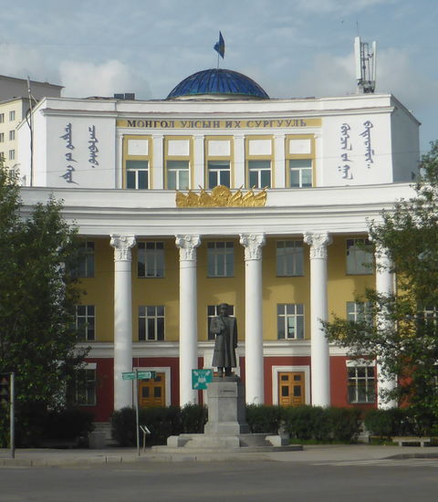 Mit dem Zusammenbruch der Sowjetunion war zwangsläufig der Zusammenbruch ihres Marionettenregimes in Ulan Bator verbunden. Nach Massendemonstrationen im Winter 1989/90 verlor die kommunistische Staatspartei mehr und mehr die Kontrolle. Im März 1990 trat das gesamte Politbüro zurück, im Mai erfolgte die Aufhebung des Einparteiensystems, womit der Demokratisierungsprozess und die Wendung zur Marktwirtschaft begannen. Am 29. Juli 1990 fanden die ersten freien Wahlen in einem Mehrparteiensystem statt.[7] Am 12. Februar 1992 besiegelte das Parlament mit der Annahme einer neuen Verfassung das Ende des kommunistischen Systems. Zugleich verzichtete die verfassungsgebende Gewalt auf die Bezeichnung Volksrepublik. Damit wurde Ulaanbaatar die Hauptstadt des neuen Staates Mongolei.[/k] aus Wikipedia