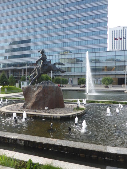 Reiterdenkmals Dschingis Khans vor der modernen Kulisse von Hotels und Kaufhäusern - sehr beliebt z.Zt.: kleine Automodelle, in denen Kinder fahren können
