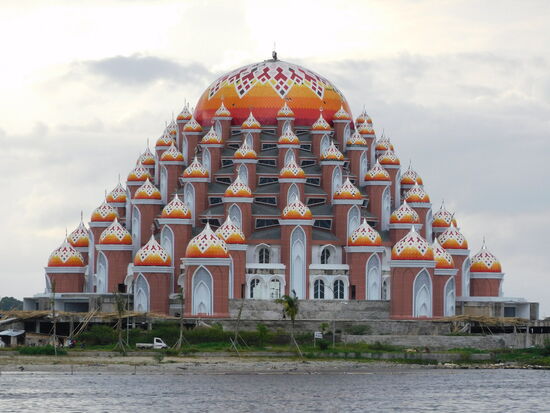 In Makassar an der Promenade bestaunen wir eine wunderschöne Mosche. Die, wie eine russische Kirche, mit all ihren Zwiebeltürmen, aussieht. Gegessen wird wieder in den billigen Strassenrestaurants, was so um die 1 - 2.- Fr. pro Person kostet. Allerdings gibt es nur wenig Auswahl. Gebratener Reis ist meistens eine gute Wahl und wird hier mit rosa Reis und Chips serviert.