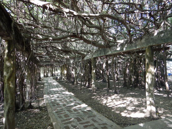 Da hier weder geklaut noch eingebrochen wird, werden wir gratis mit Velos, ohne Schlösser, ausgerüstet und so fahren wir zu einem über 350 Jahre altem Baum. Überall ragen Luftwurzeln in den Boden und damit der Baum nicht einstürzt, wird er mit Betonsäulen gestützt.