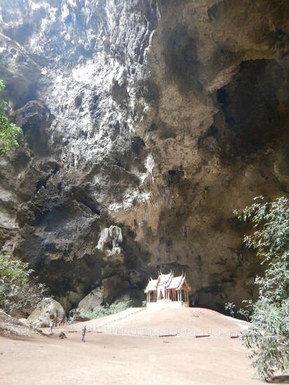 Der letzte Tempel wird im Nationalpark Khao Sam Roi Not besichtigt. Bei schönem Wetter wird hier ein kleiner Tempel inmitten einer Höhle, von den frühen Sonnenstrahlen beleuchtet. Unsere Mädels freuen sich riesig über die einstündige Fahrt im Tuktuk, das uns zu der Küste bringt. Anschliessend werden wir in einem kleinen Boot um eine Felswand in den Park gebracht. Riesige Stalaktiten und Stalakmiten sind zu sehen und natürlich verpassen wir auch den kleinen Tempel nicht.