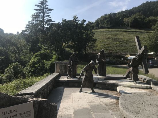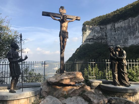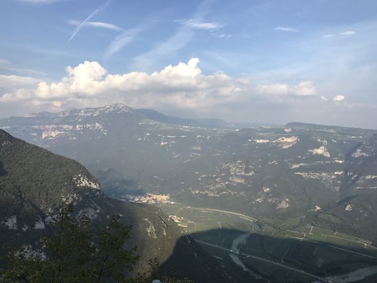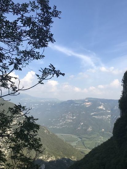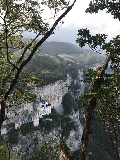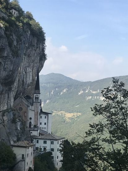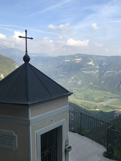 Ich bin vollkommen beeindruckt! Nicht von meiner morgendlichen Shoppingtour in Bardolino oder meinem Mittags-Sonnenbad im See. Nein, ich bin vollkommen beeindruckt von der Madonna della Corona! Eine Wallfahrtskirche, eine Pilgerstätte, die 800 m über der Etsch an der Felswand klebt! Die Fahrt hierhin ist schon wunderschön. Durch das Val‘ Adige, wo grade die Traubenernte stattfindet, vorbei an Oliven und Zypressen und dicken blauen Trauben. Serpentinen hoch die Straße Richtung Spiazzi. Von dort kann man mit einem Shuttlebus oder zu Fuß eine Straße hinab gehen, in jeder Kurve sind Symbole der Kreuzigung und Auferstehung Jesus. Oder man nimmt den direkten Weg mit ganz vielen Stufen und unterhalb der Bushaltestelle an der Kirche noch einen alten Pfad durch den Wald! Das ist mein persönlicher Favorit, auch wenn er länger ist! Die Kirche klebt wirklich am Fels! Unten 800 m Abgrund, oben steiler Fels! Und ein atemberaubender Blick ins Etschtal. Es ist hier eine ganz besondere Atmosphäre, die einen ruhig werden lässt! So beeindruckend es vor Ort ist, so hat mich ein Panoramablick von dem gegenüberliegenden Berg noch mehr aus den Socken gehauen!