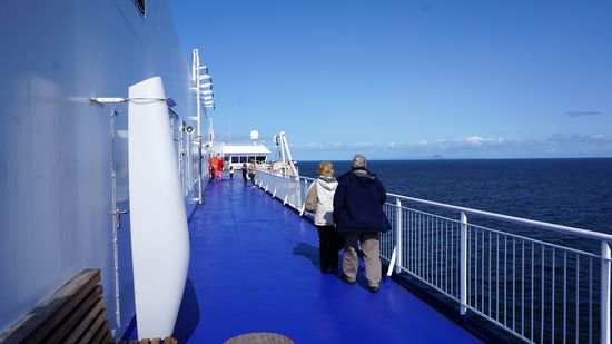 Die Überfahrt dauert circa zwei Stunden. Ich setze mich in die Sonne, trinke einen Kaffe und als nach einer Stunde keine Schlange mehr am Buffet steht, genehmige ich mir noch einmal Fish and Chips.