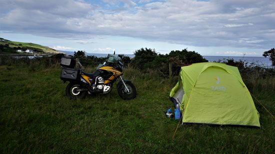 Als ich in Belfast ankomme regnet es. Ich fahre Richtung Norden und suche an der Küste einen Zeltplatz. Dabei fallen mir einige Leute auf, die direkt am Strand ihr Lager aufgeschlagen haben. Ich frage mal nach und es heißt, sie campen hier wild und ich könne mich ruhig dazu stellen. Es wird eine herrliche Nacht mit frischem Wind und dem Rauschen des Meeres.