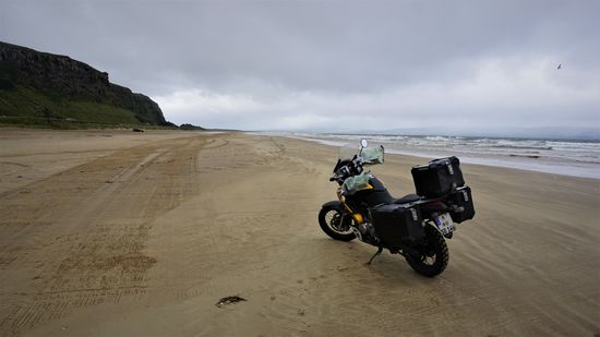 Am nächstem Tag ist zwar kein Dauerregen mehr aber die Sonne schafft es auch noch nicht, sich durch zu setzen. Ich mache eine Rund durch Nordirland. Hier am Strand könnte man entlang donnern, doch das lasse ich lieber bleiben. Sand ist Gift für die Kette, er wirkt wie Schmirgelpapier.