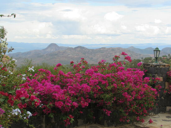 In Konso machen wir Pause in einer sehr schönen gepflegten Lodge. Von hier genießen wir einen super schönen Ausblick, eingerahmt von blühenden Rank- Gewächsen.