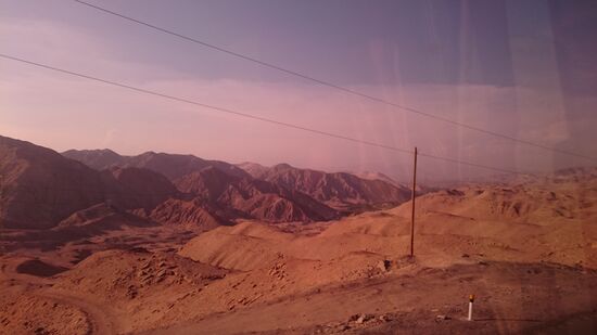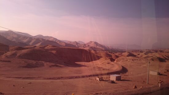 In Peru ändert sich die Landschaft. Im Abendlicht schimmert die Wüste rötlich. Es wird bergig. Dadurch ist die Strecke sehr kurvenreich. Fast die ganze Nacht geht es auf kurvigen Straßen durch die Berge von Peru bis die Landschaft am Morgen flacher wird. Links der Wüstenstrand, hin und wieder eine Ferienanlage. Bis die Besiedlung dichter wird und der Bus durch das Verkehrschaos von Lima in den Busbahnhof der Gesellschaft abbiegt. Verriegelt, nur für den Bus wird geöffnet. Drinnen warten sichere Taxis.