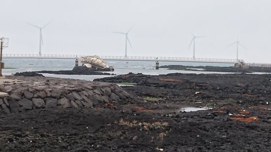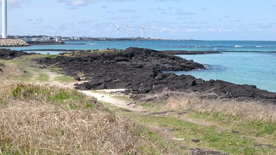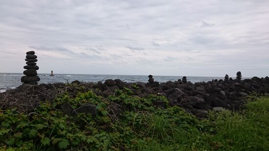 Die Insel Jeju ist eine südlich vor Korea gelegene Insel mit mildem Klima. In der Mitte ein Vulkan, der die Insel gebildet hat. Mich reizt der 200 km lange Radweg, der rund um die Insel führt. Dafür muss ich mit der Fähre von Busan nach Jeju fahren. Die Fähre fährt über Nacht. In strömendem Regen gehts zum Passagierterminal. Der Platz ist reserviert. Ich muss nur noch bezahlen und..... das Rad auf die Fähre bringen. Am Terminal sehe ich eine koreanische Radgruppe. Ältere Radler, die mit MTBs unterwegs sind. Sobald ich meine Fährfahrt bezahlt habe und unschlüssig in der Halle stehe, weil ich mal wieder nur die Hälfte verstanden habe, kommt einer der Radler und zeigt mir den Weg auf die Fähre. Die Gruppe fährt für ein verlängertes Wochenende nach Jeju, um die Insel zu umrunden. Die Verständigung ist äußerst kompliziert. Sie sprechen ganz wenig englisch und das, was sie sagen ist ganz schlecht zu verstehen. Schließlich zeige ich Bilder von dem Frachtschiff, um zu erklären, wie ich nach Busan gekommen bin und sie zeigen Bilder von einer Gruppenfahrt mit Rädern nach Vietnam. Ich möchte Richtung Osten starten, sie Richtung Westen. Zu dem Zeitpunkt ahne ich noch nicht, dass der Radweg nur in eine Richtung ausgeschildert ist: Nämlich Start Richtung Westen.