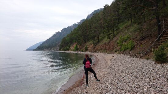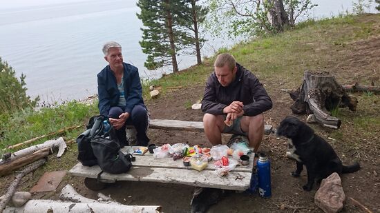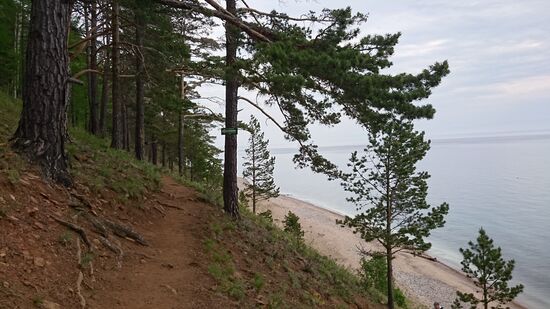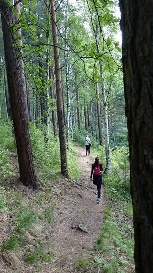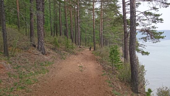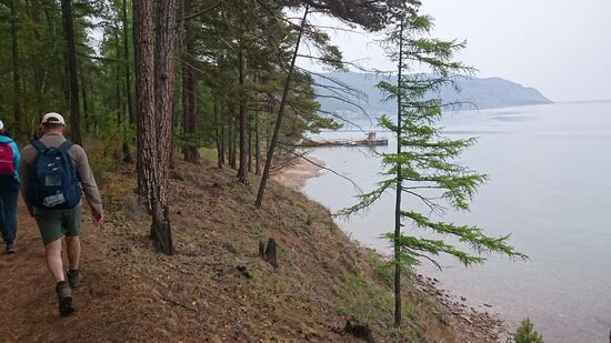 Samstags mache ich eine von der Schule angebotene Wanderung auf dem Baikal Trail von Listwjanka nach большие котьи. Wir fahren ganz früh mit dem Taxi nach Listwjanka. 25 km sind zu wandern.  Um 17 Uhr fährt das Schiff zurück nach Listwjanka.  Der Weg scheint sehr beliebt zu sein. Viele kleine und größere Gruppen starten fast gleichzeitig mit uns. Teils mit schwerem Gepäck,  um in большие котьи zu zelten und zurück zu wandern.  Unterwegs wird gepicknickt und gesungen.