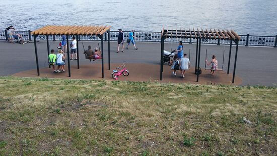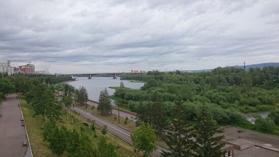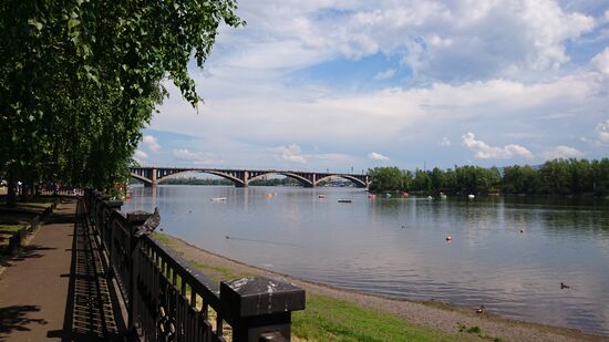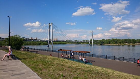 Am Ufer des Jenissei breitet sich über mehrere Kilometer ein Park mit Promenade aus. Eine Brücke verbindet die Anlage mit einer Insel im Jenissei, die von der Bevölkerung zu unterschiedlichen Freizeitaktivitäten im Freien genutzt wird. Am sonnigen Sonntagnachmittag herrscht reger Betrieb auf Promenade und Insel. Haben mir schon die anderen Städte gut gefallen, so übertrumpft Krasnojarsk den Eindruck noch.