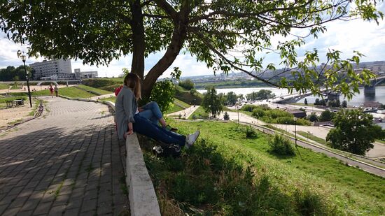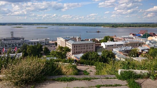 Nischni-Novgorod liegt an der Mündung der Oka in die Wolga. Auf der rechten Seite der Oka an der Mündung erstreckt sich ein Hügel und dort oben mit Blick auf Oka und Wolga liegt der Kreml. Unterhalb die Altstadt und davor eine lange Promenade. Viele Treppen den Hügel hinauf, die Teil eines Parkes am Hang sind. Dort sitzen in der Nachmittagssonne Jugendliche, Mütter mit ihren Kindern oder auch Maler, die sich an dem Panorama oder den Ansichten auf die Altstadt versuchen.