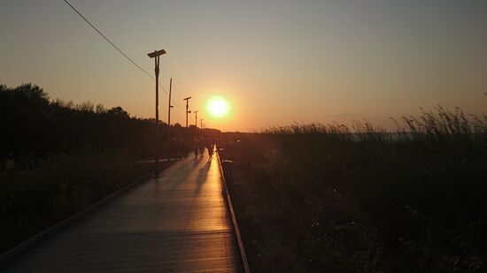 Mit der Fähre fahre ich zur vorgelagerten Halbinsel Hel. Auf schmalem Streifen durch die Ostsee geht es durch Kiefernwälder an Sandstränden vorbei. In den Orten touristisches Treiben. Polnische Touristen in der Mehrzahl. Sieben Tage fahre ich wie im Tunnel an der polnischen Ostseeküste entlang. Getrieben! Schon Abschied nehmend von meiner Reise und neue Pläne schmiedend. Aber auch mit der Frage, wie es weitergeht, wenn ich wieder daheim bin. Kein Pausentag an einem der schönen Strände. Mehrere hundert Kilometer feinster, weißer Ostseestrand. Wenn ich abends auf dem Sand laufe, ist er kalt obwohl die Tage sehr warm sind. Wieder einmal begeistert mich die Natur. Der Radweg führt oft an der Promenade entlang- zwischen Küstenbepflanzung und Wäldern oder vorgelagerten Seeen. Es gibt wirklich schwierige Abschnitte durch den Wald ca. 30 km vor und hinter Leba. Wurzel- und Sandwege lassen mich das Rad manchmal schieben. Die Natur entschädigt vielfach für die Mühen. An anderen Stellen zeigt mir mein Navigationsgerät noch unbefestigten Weg an, wo gerade frisch asphaltierte Abschnitte sind. Auf einem Abschnitt stehen sogar noch die Baufahrzeuge, die abräumen. Das Wetter ist so schön, dass ich mehrmals zelte. Die Preise an der polnischen Ostseeküste sind erschwinglich, die Infrastruktur ist gut. Ich bin glücklich, diesen Abschnitt zu fahren und Polen kennenzulernen. Viele Familien und junge Leute verbringen hier ihren Urlaub. Abends Straßenmusiker in den Seebädern, die vom Publikum gefeiert werden. Besonders nachdem ich auch den deutschen Abschnitt des Ostseeküstenradwegs geradelt bin, kann ich die polnische Seite wärmstens empfehlen. Und immer wieder komme ich mit Menschen ins Gespräch, die auf unterschiedliche Art reisen.