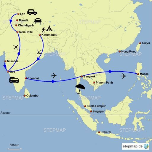 Wieder mal 8 Tage in Benaulim (Goa) Strand und Ruhe und Essen genießen. Ans Klima (wahrscheinlich viel Regen) gewöhnen. Dann nachmittags mit SpiceJet (85€) nach New Delhi und (um den Moloch Delhi zu vermeiden) direkt weiter mit einem Gozocabs-Taxi nach Chandigarh. Übernachten. Und morgens 10 Stunden mit dem HRTC-Bus nach Manali (ca. 25€). In Manali ins Rockys guesthome, hoch oben über Alt-Manali mit einer herrlichen Aussicht über das Tal. Manali liegt auf einer Höhe von 2.000 m. Deshalb erstmal daran gewöhnen und 4 -5 Tage abhängen und Trekking und Ausflüge in die Umgebung.