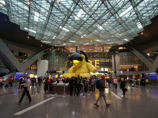 Kurz nach 5Uhr ist der erste Teil des Fluges geschafft, Zwischenlandung in Doha. Der Flug war recht unruhig, "Schlechtwegestrecke"