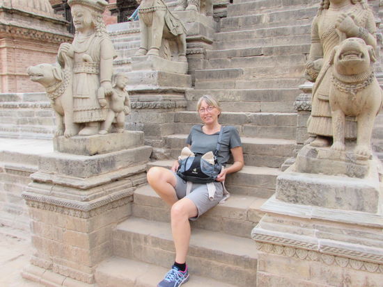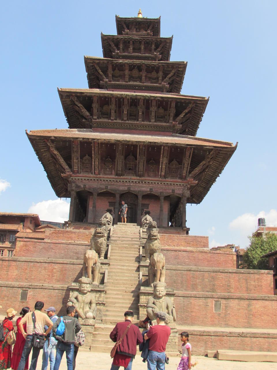 Wir gehen in nur wenigen Minuten weiter zum Taumadi Square. Hier steht ein sehr beeindruckender Tempel, der Nyatapola Tempel. Er ist eine der ganz wenigen fünfstöckigen Pagoden weltweit. Er wurde 1702 bis 1708 erbaut. Er ist der Göttin Lakshimi geweiht.