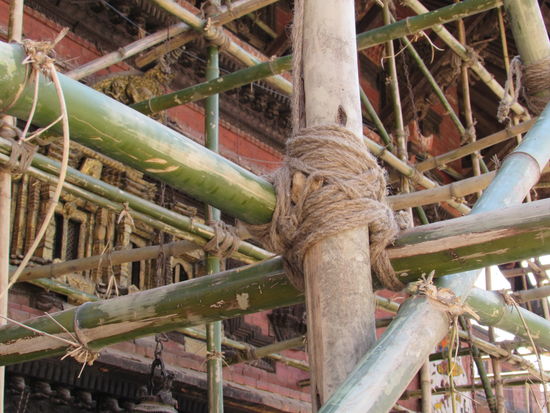 Auch hier werden die Schäden des Erdbebens behoben. Im Hintergrund unzählige nepalesische Schüler, brav hintereinander her.