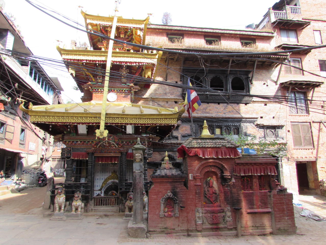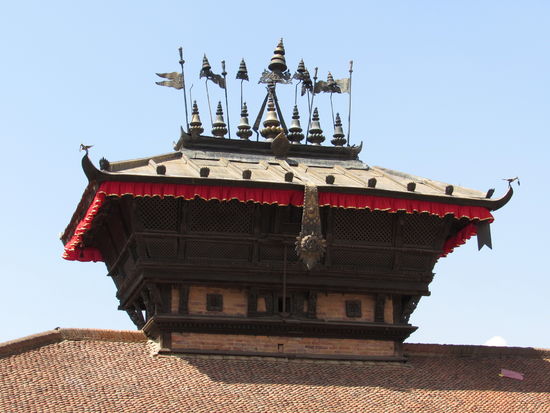 Wir sind im Kern des alten Bhaktapur. Hier findet man das Pujari Math . Es ist ein vierstöckiges Gebäude mit aufwendigen Schnitzereien und dem berühmten Pfauenfenster.