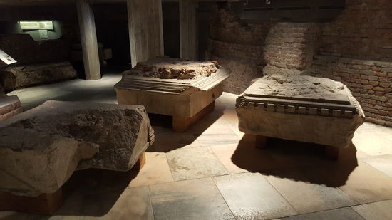 Eine enge Treppe führt zu den archäologischen Ausgrabungen —die Reste der Vorgängerbauten und zum ehemaligen Baptisterium
