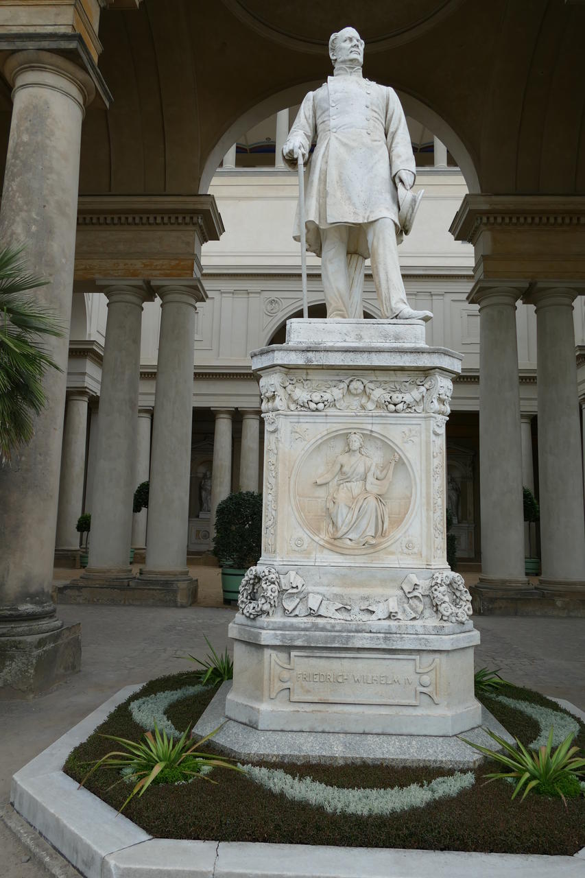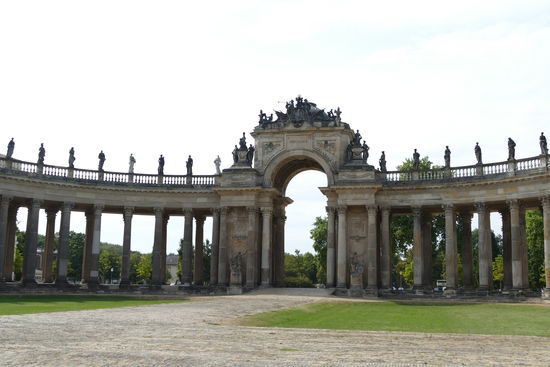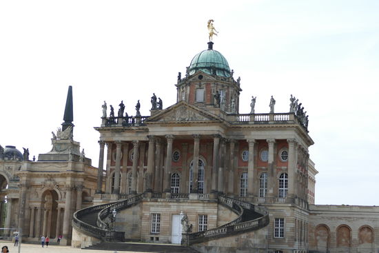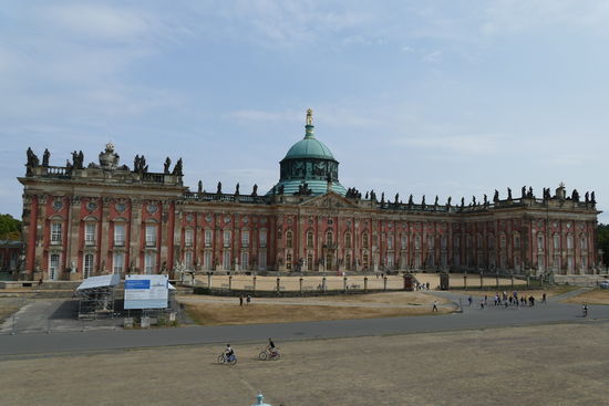 Wir verlassen die Anhöhe und gehen hinunter zum Neuen Palais. Hier verschlägt es uns erst einmal die Sprache ob der gigantischen Ausmaße dieses Bauwerks. Einfach riesig und irgendwie fühlen wir uns architektonisch an den Dresdner Zwinger erinnert. Es besteht jedoch auch hier noch enormer Renovierungsbedarf.