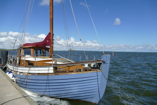Die Straße wird immer schmaler, dann wird sie zu einer Kopfsteinpflaster-Piste und schließlich zu zwei Betonstreifen mit Gras dazwischen. Entsprechend landen wir in einem kleinen, ruhigen Dörfchen mit einer Marina und einer Personen-Fähre hinüber nach Usedom.